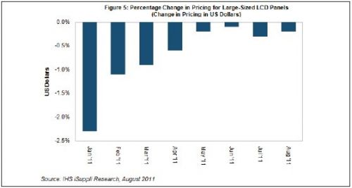 據IHS iSuppli公司的液晶顯示器(LCD)價格研究報告,8月份大尺寸LCD麵板價格下降速度預計略慢於7月,供應商積極降低產能利用率預計會防止麵板價格進一步下滑。