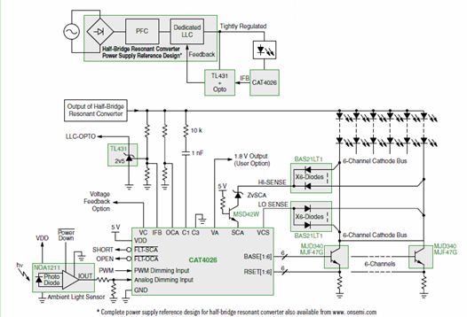 采用NCP1397 和CAT4026的46 英寸液晶電視背光方案由LED 背光轉換器(NCP1397 等器件)和LED 控製器(CAT4026 等器件)組成。安森美半導體的NCP1397 初級端控製器配合帶正向電壓監測功能的6 通道線性LED 驅動器CAT4026 等器件,支持低高度LED 背光液晶電視設計,使電路板上高度低於8 mm,總高度低於12.5 mm,還可以很好地處理寬範圍調光、散熱、故障保護等問題,使電源設計挑戰迎刃而解。