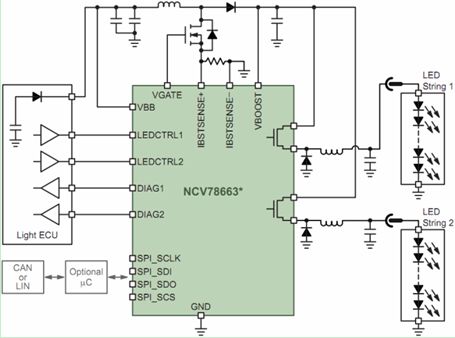 安森美半導體針對LED汽車前照燈係統開發了NCV78663電源鎮流器及雙LED驅動器。NCV78663是先進的高可靠性、高能效的係統級芯片(SoC) LED驅動器,支持達2 A電流,提供高於90%的總能效,驅動高達60 V電壓的多串LED,能以PWM調光維持色溫及控製平均電流,使設計人員能夠以一顆高集成度的SoC控製遠光燈及近光燈、日間行車燈、轉向指示燈及霧燈,所需外部元件極少。這器件通過SPI接口與外部微控製器通信,在上電後動態地控製係統參數、檢測LED工作狀態並反饋診斷信息。圖4顯示的是NCV78663在先進的汽車前照燈應用中的電路圖。