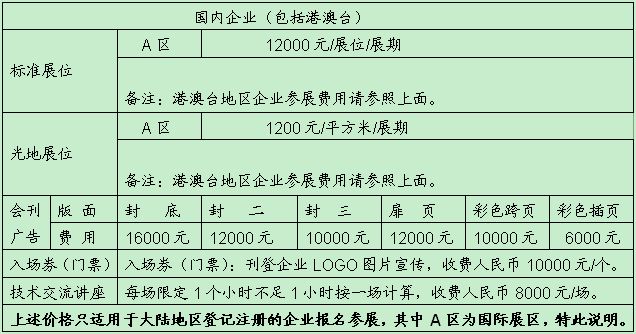 1、標準展位(3m×3m﹦9M2,配置:公司中英文楣牌、展出場地、展位地毯、三麵2.5M高圍板、一張洽談桌、二把椅子、一個220V電源插座、兩支射燈。)