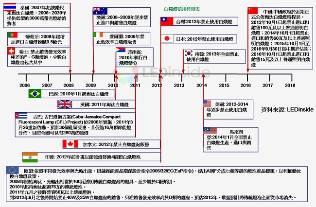 而2014年10月1日起禁止進口和銷售60瓦及以上普通照明白熾燈相對來說更為重要 ,由於60W與60瓦到100瓦之間的白熾燈泡使用數量龐大,也是LED燈泡進軍主照明市場的關鍵產品區塊,因此2014年以後將會是發展關鍵。以歐盟的腳步來看,已經從2009年9月1日開始禁止其27個成員國購進100瓦白熾燈,而日本 方麵則是提出2012年全麵禁用白熾燈,南韓則預計是2013年底禁用。