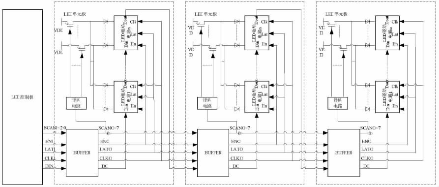 LED 控製板與LED 單元板構成的LED 顯示係統的主體,如圖1 所示。其中,LED 單元板包括了增強信號驅動能力的BUFFER 電路、產生動態顯示掃描時序的譯碼電路、若幹個開關管和若幹個LED 驅動電路。其通信過程為:LED 控製板發出的通信信號依次經過各串接的LED 單元板的BUFFER 電路進行驅動增強;各LED 單元板中經BUFFER 電路增強後的掃描信號(SCANO)提供給本LED 單元板的譯碼電路,譯碼電路譯碼產生動態顯示掃描時序控製開關管;各LED 單元板中經BUFFER 電路增強後的使能信號(ENO)、鎖存信號(LATO)、時鍾信號(CLKO)分別提供給本LED 單元板中所有LED 驅動電路。