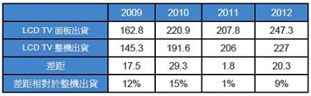 液晶電視整機出貨與麵板出貨之間的差距 (單位:百萬片)