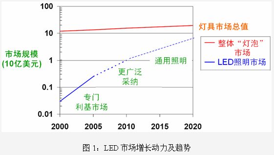 高亮度LED的光輸出、能效及成本正在迅速改善,使其應用範圍不斷擴大。根據LED的工作電壓可以劃分為三個功率等級:0.9V至7V(手機和移動設備)、7V至60V(汽車和LCD背光)和60V至700V(通用照明)。這當中市場成長潛力最大的是汽車、LCD背光和通用照明。汽車應用主要包括氖燈替代、應急車輛燈、組合尾燈、儀表盤照明、信息娛樂、內部照明、中央高位刹車燈、前照燈、停車燈等;LCD背光主要包括大屏幕液晶電視、中等屏幕的筆記本、GPS、相框、上網本等;通用照明主要有離線LED驅動器/鎮流器、街道/區域照明、替代燈泡、替代熒光燈、交通信號燈、工作照明、景觀照明、建築物照明等。不難看出,今後LED照明將逐步進入到更多的應用領域。