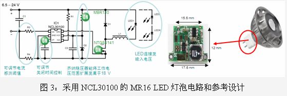 還有一款MR16 LED方案是用於降壓型應用的NCL30100,它是能效大於95%的LED驅動器控製器,開關頻率高達700kHz,不需要輸出電容,Vcc工作範圍從6.35至18 V,可以驅動一個或多個大功率LED,主要用在MR16 LED照明、環境燈照明、太陽能LED、交通照明、室外照明和LED光條等應用。其PCB非常小巧,可以裝入MR16燈的燈座內。NCL30160的遲滯控製特性可在負載瞬期間提供快速的回應,無需小型信號控製環路補償元件。保護特性包括可利用電阻設定LED電流、LED短路保護、欠壓鎖定及熱關閉。