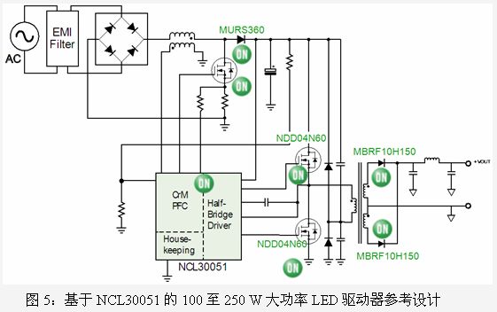 另一款專用LED電源集成電路是NCL30051,能夠為降壓直流-直流(DC-DC)轉換器/LED驅動器提供恒定電壓。該器件集成了一個臨界導電模式(CrM) PFC控製器及一個半橋諧振控製器,並內置600V驅動器,針對離線電源應用進行了優化,具備了所有實現高能效、小外形因數設計所需的特性。