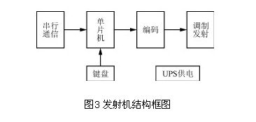 發射機由單片機、鍵盤、編碼器、發射器、串行通信接口和UPS供電係統組成,其結構框圖如圖3所示。