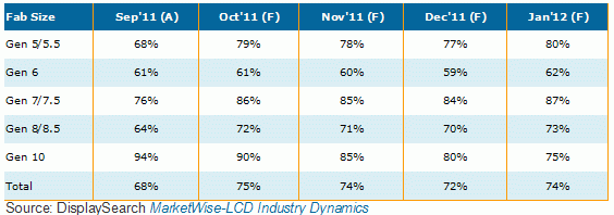 在前幾個月裏,TFT-LCD麵板廠一直控製生產以減少庫存並降低損失。但根據DisplaySearch MarketWise-LCD Industry Dynamics報告指出,10月稼動率從9月的68%上升到了75%。