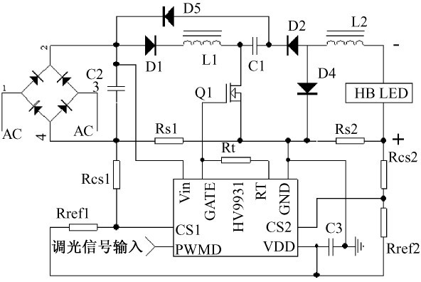 電路工作於峰值電流模式下, 振蕩器使GATE輸出高電平, 使Q1 通導通; CS1 和CS2 端子分別是HV9931 內部的兩個電壓比較器的反向輸入端,兩個比較器的同向輸入端在芯片內部接地,電路通過CS1 和CS2 端子同時檢測輸入電流和輸出電流,CS1 是輸入電流信號檢測端子,CS2 輸出電流信號檢測端子,這兩個端子隻要有一個端子上的電壓比地低,GATE 端子就輸出低電平,Q1 就關斷。VDD是芯片的基準電壓輸出引腳,Rs1、Rcs1 和Rref1 可編程設定L1 中的最大峰值電流, Rs2、Rcs2 和Rref2 可(ke)編(bian)程(cheng)設(she)定(ding)輸(shu)出(chu)電(dian)流(liu)。在(zai)交(jiao)流(liu)電(dian)的(de)周(zhou)期(qi)內(nei)可(ke)認(ren)為(wei)占(zhan)空(kong)比(bi)和(he)開(kai)關(guan)頻(pin)不(bu)變(bian),故(gu)輸(shu)入(ru)電(dian)流(liu)峰(feng)值(zhi)包(bao)絡(luo)線(xian)為(wei)正(zheng)弦(xian)波(bo),平(ping)均(jun)電(dian)流(liu)為(wei)正(zheng)弦(xian)波(bo),可(ke)實(shi)瑞(rui)功(gong)率(lv)因(yin)數(shu)校(xiao)正(zheng)。