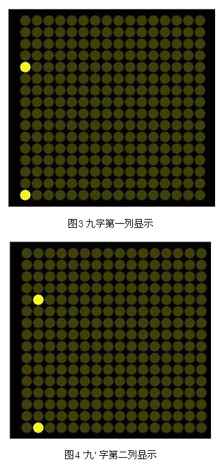 從圖3 中我們可以看出, 要把'' 九'' 字顯示出來, 先顯示''九'' 字的第一列, 就是讓P0 口輸出00001000,P2 口輸出00000001,對應的列上,74LS154 輸出低電平,即P1 口輸出00H,然後保持顯示1MS。