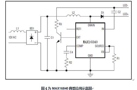 而MAX16840芯片有3個重要引腳功能:FB引腳電壓可檢測輸入電流,並調節其平均值;而輸入引腳(REFI)用(yong)於(yu)設(she)置(zhi)輸(shu)入(ru)電(dian)流(liu)值(zhi),引(yin)腳(jiao)電(dian)壓(ya)低(di)於(yu)特(te)定(ding)門(men)限(xian)時(shi),輸(shu)入(ru)電(dian)流(liu)與(yu)該(gai)電(dian)壓(ya)成(cheng)正(zheng)比(bi),電(dian)壓(ya)超(chao)過(guo)特(te)定(ding)門(men)限(xian)時(shi),輸(shu)入(ru)電(dian)流(liu)將(jiang)置(zhi)於(yu)固(gu)定(ding)的(de)預(yu)置(zhi)水(shui)平(ping)。據(ju)此(ci)利(li)用(yong)REFI的非線性特性,連接一個NTC電阻,即可得到熱折返保護;IN引腳具有內部過壓保護,避免內部開關MOSFET在LED串開路或LED串電壓過高時損壞;它帶有一個獨立的EXT引腳,確保低輸入電壓開啟時提供一個觸發啟動電流,以配合電子變壓器正常工作。EXT驅動外部npn晶體管,一旦IN跌落到5.5V UVLO門限以下,將EXT拉至地電平,外部npn晶體管關斷。其IC采用3mm x 3mm、10引腳、TDFN封裝,-40°C至+125°C工作溫度範圍。圖4為MAX16840典型應用示意圖。它被廣泛應用於MR16及其它12V交流或直流輸入LED照明之中。