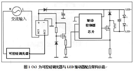 所以它是LED照明常用方法,見圖1(b)所示可控矽調光器與LED驅動器配合架構示意。