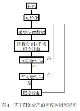 基於圖像處理的程序流程圖如圖4 所示。初始化係統後, 經過采集圖像數據, 將采集來的數據進行計算:先進行圖像分割, 然後進行圖像特征提取,區分亮區和暗區, 計算平均照度。判別照度值是否符合要求:如果照度值符合要求, 重複采樣圖像數據; 如果照度值不符合要求, 就輸出控製信號來調節燈的亮度, 之後, 重複采樣圖像數據, 進行下一個循環。