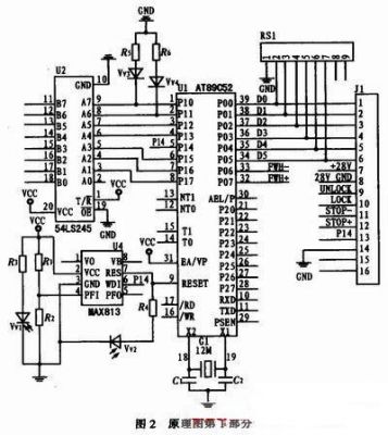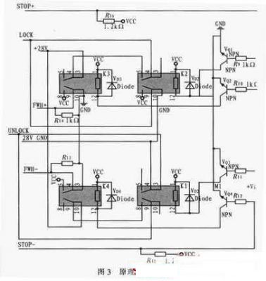 當信號D0-D5為10000時,單片機通過P10口對方位鎖定機構發出加鎖命令,控製命令經SN54LS245驅動後作用於R9和VQ1,VQ1導通後,繼電器K2的4、5導通,輸出+28 VLOCK信號控製電機進行加鎖。完全鎖定後,光電開關輸出(上)信號輸出高電平即圖3中STOP+,STOP+通過上拉電阻R16作用於R10和VQ2,VQ2導通後,繼電器K3的4、5和8、9導通,+28 V LOCK信號切斷,硬件上先停止加鎖控製,防止造成機構硬件損傷。而K3的8、9導通後,FWH+輸出+5 V電平給單片機,單片機接收信號後,終止加鎖命令,VQ1截止,K3恢複常態。解鎖過程和加鎖過程類似,在此不作贅述。