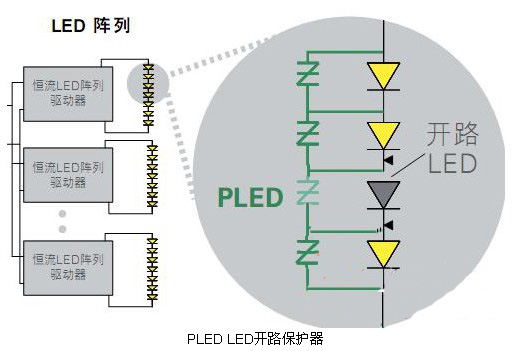 以上方案能夠有效的應對電源部分產生的浪湧威脅,保護LED免受損壞。但是我們都知道,LED燈等通常由一定數量的LED管串接或並聯組成陣列,單個LED損壞會造成的整個LED陣列的停止工作。傳統的fuse、MOV、TVS並不能保障此類問題。因此在LED陣列端,LF專門為LED開路研製了PLED LED開路保護器,如圖所示:
