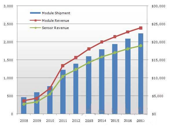 2011年的觸摸麵板因智能手機市場的增長而“風光無限”。據美國FPD相關調查公司DisplaySearch預測,2011年全球智能手機麵板市場與上年相比將實現90%以上的迅猛增長,並且預測在2015年之前還將以年均43%的速度增長。由於智能手機市場迅猛增長,輸入和操作所需的觸摸麵板市場隨之迅速擴大。據DisplaySearch介紹,觸摸麵板的整體市場規模2011年達到了12億片,超過130億美元。預計按數量計算將比上年大幅增長60%,按金額計算將大幅增長90%(圖1)。