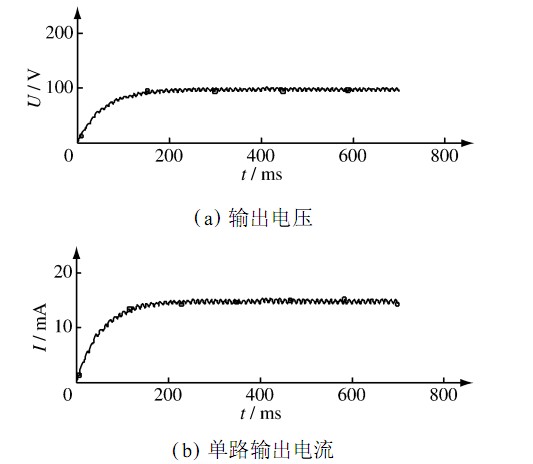 為理論上驗證設計的可行性,采用PSp ice軟件對電路進行了仿真分析。結果如圖2所示。電路在210 ms時進入穩定狀態,穩定後其輸出電壓為97 ±2. 2 V,輸出電流為14. 7 ±0. 3 mA,基本驗證了電路設計的可行性。LED 日光燈電路輸出特性如圖2所示。