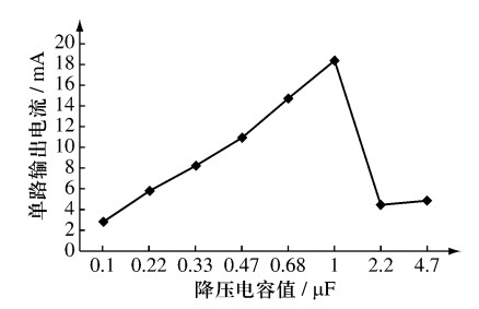 在不損壞LED的條件下進行了測試,降壓電容C1 的電容值與輸出電流的關係如圖4所示(因為兩個電容是相同的,圖4中隻表示出單一電容值)。可見,隨著電容值的增加,輸出電流幾乎呈線性上升,待增加到一定值時(約20 mA) ,保護電路起作用,迫使經過LED支路的電流下降。
