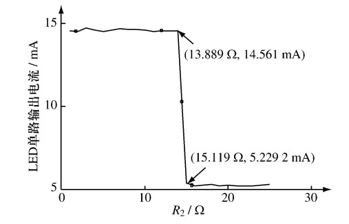 為驗證輸出保護電路的功能,對電阻R2 進行參數掃描分析,之後進行性能分析。結果如圖3所示。可以看出,當R2 從1 Ω 增大到13. 889Ω時,輸出電流開始下降,表明此時單向晶閘管處於臨界導通狀態;然後隨著R2 的繼續增大,輸出電流急劇下降,直至R2 為15. 119Ω時,輸出電流穩定在5. 2 mA 左右,表明單向晶閘管已經完全導通,保護電路已經起作用。