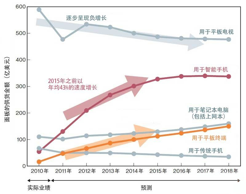 各ge公gong司si強qiang化hua中zhong小xiao型xing麵mian板ban業ye務wu的de原yuan因yin在zai於yu市shi場chang的de迅xun速su變bian化hua。推tui動dong麵mian板ban業ye務wu發fa展zhan的de主zhu角jiao正zheng逐zhu漸jian從cong此ci前qian的de電dian視shi機ji用yong大da型xing產chan品pin向xiang智zhi能neng手shou機ji和he平ping板ban終zhong端duan用yong中zhong小xiao型xing產chan品pin轉zhuan變bian。據ju美mei國guoDisplaySearch公司調查,電視機麵板按金額計算呈緩慢的負增長,而智能手機和平板終端用中小型麵板預計2015年之前按金額計算均將實現年均40%以上的增長率(圖2)。[page]