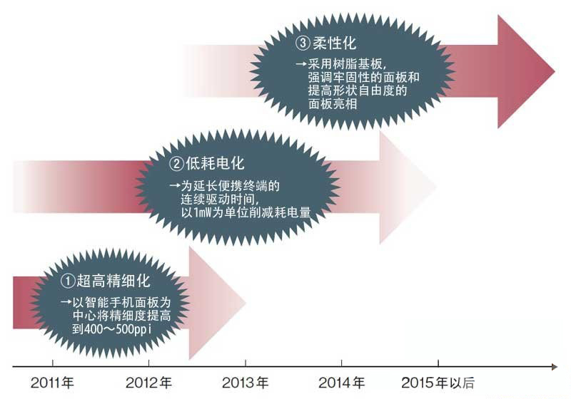 ①超高精度化的目標是,能在智能手機麵板上顯示1920×1080像素的全高清影像。為此,需要將分辨率由目前的330ppi提高至400~500ppi。②低耗電量化方麵,為延長便攜終端的連續驅動時間,需要以1mW為單位不斷削減耗電量。③柔性化方麵,為實現具有高堅固性和高形狀自由度的麵板,需要采用樹脂基板。