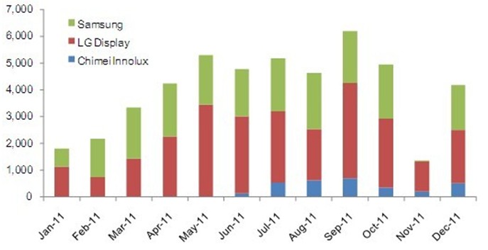 2011年9.7" iPad平板電腦麵板出貨達到了4千8百萬片。雖然麵板廠商之前的出貨預期更高,但受到了第四季度庫存調整的影響而最終無法達到2011年全年5千萬片以上的目標。2011年的9.7寸麵板出貨以XGA(1024x768)規格為主,亮度要求為400nits以上;且采用了IPS或FFS規格的廣視角技術,而主要的麵板供貨商為韓國的三星、LG Display與台灣的奇美。根據NPD DisplaySearch每月TFT LCD麵板出貨報告(Monthly TFT LCD Shipment Database),三家9.7寸麵板供貨商在2011年的出貨各有千秋,如下圖所示。