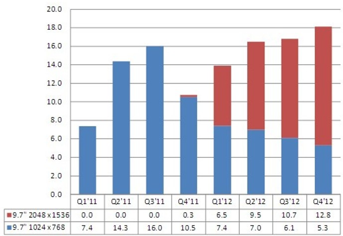 根據NPD DisplaySearch最新的季度全球平板顯示器需求預測根據NPD DisplaySearch最新的季度全球平板顯示器需求預測報告(Quarterly Worldwide FPD Shipment and Forecast Report),2012年9.7寸麵板出貨將達6千5百萬片以上,如以下附圖所示,其中QXGA分辨率出貨數量將會超越XGA分辨率,顯示iPad機種的切換,不過NPD DisplaySearch認為,實際XGA與QXGA數量的轉換將視消費者對於QXGA高分辨率的接受度、以及麵板廠對於9.7" QXGA的生產穩定度,來進行調整。