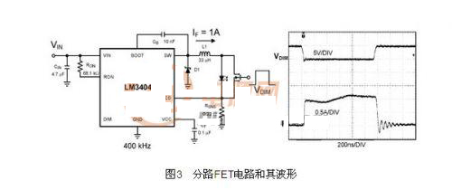 從cong一yi個ge沒mei有you輸shu出chu電dian容rong器qi的de快kuai速su降jiang壓ya穩wen壓ya器qi著zhe手shou,出chu現xian在zai輸shu出chu電dian流liu開kai啟qi和he關guan閉bi的de延yan遲chi,是shi來lai自zi集ji成cheng電dian路lu本ben身shen的de傳chuan導dao延yan遲chi和he輸shu出chu電dian感gan器qi的de物wu理li特te性xing。若ruo要yao達da到dao真zhen正zheng高gao速su的dePWM調光,兩個延遲都須被略過(By Pass)。要實現這個目標,最佳方法就是采用一個與LED並聯的電源開關(圖3)。當LED關閉時,驅動電流便會分流通過開關,作用就如同一個典型的N型金屬氧化半導體場效晶體管(N-MOSFET),這時集成電路會繼續運行,而電感器電流也會持續流動。該方法的最大缺點在於LED關閉時,即使期間的輸出電壓下降到與電流感測電壓相同,仍會浪費功率。