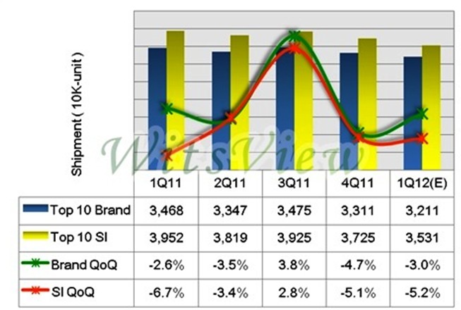 展望2012第di一yi季ji整zheng體ti出chu貨huo狀zhuang況kuang,由you於yu第di一yi季ji為wei歐ou洲zhou國guo家jia還hai債zhai高gao峰feng期qi,加jia上shang歐ou元yuan區qu信xin用yong緊jin縮suo,不bu僅jin將jiang衝chong擊ji歐ou洲zhou地di區qu經jing濟ji,且qie將jiang連lian帶dai波bo及ji其qi餘yu國guo家jia出chu口kou動dong能neng,第di一yi季ji出chu貨huo可ke能neng將jiang持chi續xu較jiao上shang一yi季ji衰shuai退tui3%~5%,較2011年同期則下滑約3%。WitsView預期1~3月出貨將如倒吃甘蔗漸入佳境,液晶顯示器下遊廠商保守的備貨氣氛在品牌客戶新機鋪貨需求的帶動下,出貨將有較明顯起色。