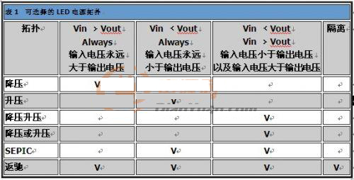 表1的信息可供作選擇LED驅qu動dong器qi最zui佳jia切qie換huan拓tuo撲pu的de參can考kao。除chu了le這zhe些xie拓tuo撲pu之zhi外wai,也ye可ke以yi使shi用yong簡jian單dan的de電dian流liu限xian製zhi電dian阻zu或huo是shi線xian性xing穩wen壓ya器qi,不bu過guo這zhe些xie方fang法fa通tong常chang會hui耗hao用yong過guo多duo功gong率lv。輸shu入ru電dian壓ya範fan圍wei、驅動的LED數目、LED電流、隔離、電磁幹擾(EMI)限製以及效能,都是相關的設計參數。大部分的LED驅動電路可分為以下幾種拓撲類別:降壓、升壓、降壓升壓、SEPIC以及返馳。