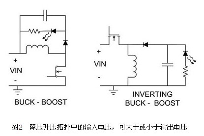 圖2顯(xian)示(shi)兩(liang)種(zhong)降(jiang)壓(ya)升(sheng)壓(ya)電(dian)路(lu),可(ke)在(zai)輸(shu)入(ru)電(dian)壓(ya)可(ke)能(neng)大(da)於(yu)或(huo)小(xiao)於(yu)輸(shu)出(chu)電(dian)壓(ya)的(de)情(qing)形(xing)下(xia)使(shi)用(yong)。這(zhe)些(xie)電(dian)路(lu)與(yu)前(qian)述(shu)兩(liang)種(zhong)降(jiang)壓(ya)拓(tuo)撲(pu)有(you)相(xiang)同(tong)的(de)折(zhe)衝(chong)特(te)點(dian),與(yu)電(dian)流(liu)偵(zhen)測(ce)電(dian)阻(zu)與(yu)門(men)極(ji)驅(qu)動(dong)的(de)位(wei)置(zhi)有(you)關(guan)。圖(tu)2dejiangyashengyatuopu,xianshijiedicankaodezhajiqudong。cituopuxuyaoweizhunyiweidianliuzhencexunhao,buguofanxiangdeshengyajiangyatuopuzejuyoujiedicankaodedianliuzhencejiweizhunyiweizhajiqudong。ruguokongzhiIC與負輸出有關,且電流偵測電阻與LED進行交換,即可利用有效的方式配置反向升壓降壓拓撲。隻要適當控製IC,即可直接測量輸出電流,也可以直接驅動MOSFET。