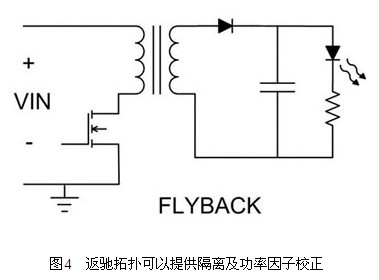 基於安全考慮,可能會規定在脫機電壓及輸出電壓之間進行隔離。此應用方式下,最節省成本的解決方法就是使用返馳轉換器(圖4),在所有的隔離拓撲中,這種作法所需要的組件數量最少。變壓器匝數比可用來對輸出電壓進行降壓、升壓或降壓升壓,設計彈性很大,不過缺點在於電源變壓器基本上是訂製組件。此外,在FET以及輸入和輸出電容器中,也會有高組件應力的情形出現。應用固定燈光時,可以使用「慢速」的回饋控製循環,調節LED電流與輸入電壓同相位的情形,進行功率因子校正(PFC)。這樣可以調節所需的平均LED電流,並能調節輸入電流與輸入電壓同相位的情形,以提供高功率因子。