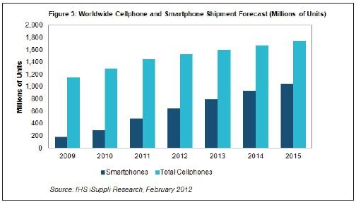 IHS公司的資深首席分析師Steve Mather 認為,2015年全球手機銷量將達17億部,其中10億部將是智能手機。這意味著2015年超過70億的人口中,14%將購買智能手機,如圖3所示。這個規模十分驚人,全球科技供應鏈紛紛調整方向,脫離電腦產業,投身於智能手機市場。時間框架:三年。
