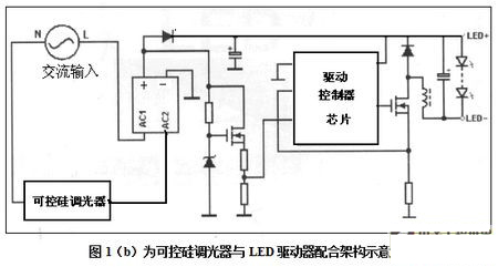 所以它是LED照明常用方法,見圖1(b)所示可控矽調光器與LED驅動器配合架構示意。