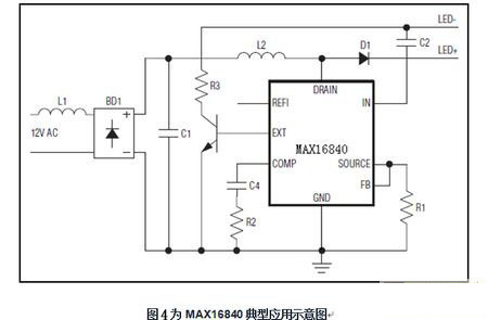 而MAX16840芯片有3個重要引腳功能:FB引腳電壓可檢測輸入電流,並調節其平均值;而輸入引腳(REFI)用(yong)於(yu)設(she)置(zhi)輸(shu)入(ru)電(dian)流(liu)值(zhi),引(yin)腳(jiao)電(dian)壓(ya)低(di)於(yu)特(te)定(ding)門(men)限(xian)時(shi),輸(shu)入(ru)電(dian)流(liu)與(yu)該(gai)電(dian)壓(ya)成(cheng)正(zheng)比(bi),電(dian)壓(ya)超(chao)過(guo)特(te)定(ding)門(men)限(xian)時(shi),輸(shu)入(ru)電(dian)流(liu)將(jiang)置(zhi)於(yu)固(gu)定(ding)的(de)預(yu)置(zhi)水(shui)平(ping)。據(ju)此(ci)利(li)用(yong)REFI的非線性特性,連接一個NTC電阻,即可得到熱折返保護;IN引腳具有內部過壓保護,避免內部開關MOSFET在LED串開路或LED串電壓過高時損壞;它帶有一個獨立的EXT引腳,確保低輸入電壓開啟時提供一個觸發啟動電流,以配合電子變壓器正常工作。EXT驅動外部npn晶體管,一旦IN跌落到5.5V UVLO門限以下,將EXT拉至地電平,外部npn晶體管關斷。其IC采用3mm x 3mm、10引腳、TDFN封裝,-40°C至+125°C工作溫度範圍。圖4為MAX16840典型應用示意圖。它被廣泛應用於MR16及其它12V交流或直流輸入LED照明之中。