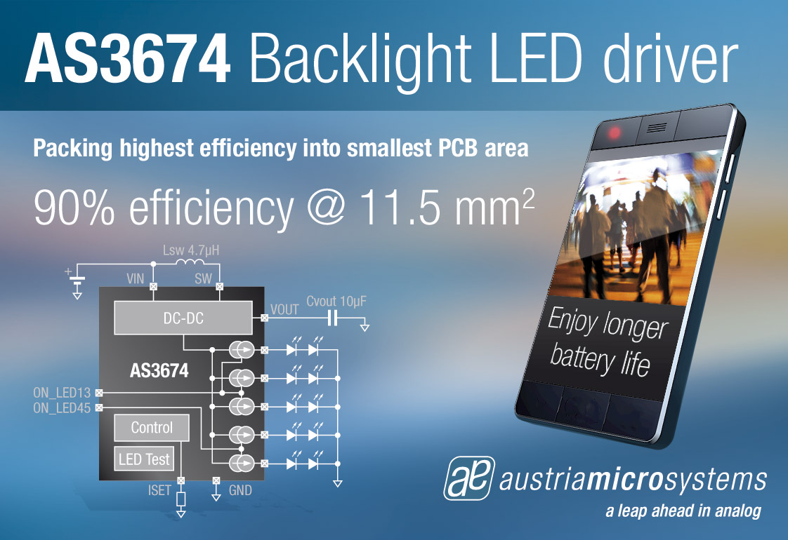 全球領先的高性能模擬IC設計者及製造商奧地利微電子公司(SIX股票代碼:AMS)宣布推出應用於智能手機LCD顯示屏的AS3674及AS3490兩款LED背光燈驅動器芯片。新品具有業內最高效能,峰值可達90%,包括DC-DC轉換器和電流源。PCB封裝僅為11.5 mm2 ,並隻需4個外接組件。AS3674及AS3490非常適合應用於智能手機和其他將空間列為首要需求的移動設備。