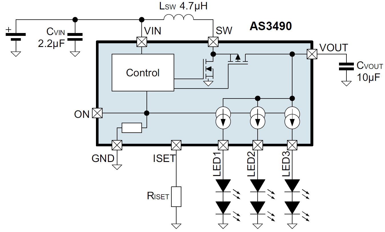 軟啟動的特點使AS3674更容易集成到對噪音敏感的無線射頻係統中。AS3674由兩組輸入電路控製,也可用介於100-800赫茲的PWM電路控製,實現1:2000的調光比。單通道兩個LED的配置結合2 MHz的轉換器操作頻率,實現使用諸如4.7µH電感的微小外部組件並取得優於競爭對手最高達6%的高效率。
