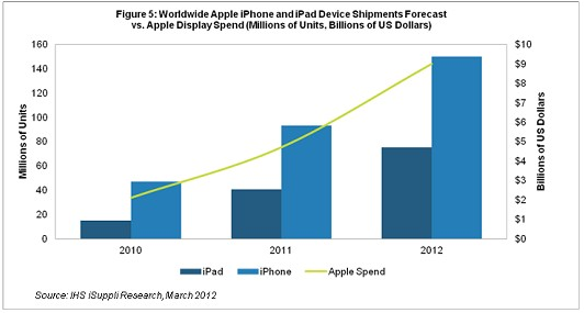 據IHS iSuppli公司的研究報告,由於預計iPhone和iPad產品出貨量今年大幅增長,蘋果2012年可能在這兩款產品的顯示器麵板上麵支出90億美元,進一步確保其在平板電腦和手機市場中的主導地位。