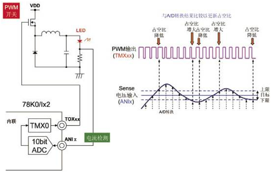 第二種是通過A/D轉換器進行反饋控製,使用A/D轉換器檢測LED電流,通過改變PWM輸出占空比實現恒流控製。通過改變A/D轉換的目標值實現各通道的獨立調光,如圖3所示。