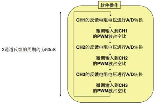 LED恒流控製操作流程圖如圖4所示,如圖,有3通道的LED需要控製,是A/D轉換→PWM輸出的微調的重複操作。軟件操作過程是對CH1的反饋電阻電壓進行A/D轉換,微調輸入到CH1的PWM波占空比,然後對通道2和通道3進行同樣操作,重複上述流程即可。三個通道的A/D轉換和檢測調整的整個周期約為50μs。