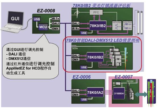 瑞薩電子的照明參考方案由3部分組成,可通過PC端GUI進行調光控製,PC和通信板通過USB線連接,情景照明板和通信板之間可以由紅外、DALI及DMX512三種方式實現,在瑞薩電子的照明參考方案中,可以使用AppliletEZ for HCD程序自動生成工具,實現照明控製程序的涉及、編譯和燒寫。照明參考方案如圖5所示。