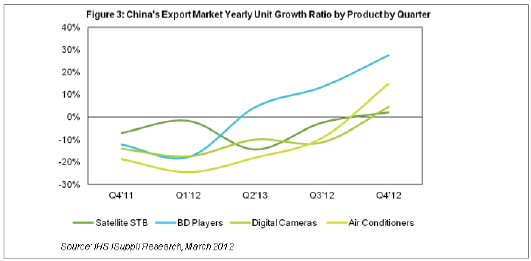 據IHS iSuppli公司的中國研究報告,全球經濟增長速度低於預期將在2012年上半年損及中國消費電子出口市場,衛星機頂盒(STB)、藍光光盤(BD)播放器、數碼相機和空調銷售將全麵下滑。