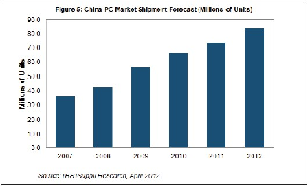 IHS公司預測,2012年中國占全球台式PC出貨量的份額將從2011年的7%上升到11%。