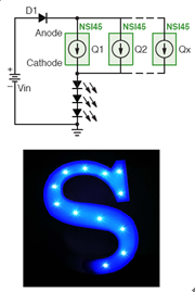 NSI45的另一個典型應用是用作顯示屏和廣告牌文字電路的恒流穩流器線性LED驅動器。其特點包括低啟動電壓,無論正向電壓(Vf)如何變化都可以實現精密穩流,具有負溫度係數特性,可以保護LED。