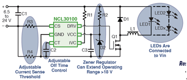 該驅動器控製器開關頻率高達700kHz,不需要輸出電容,Vcc工作範圍從6.35至18 V,可驅動一個或多個大功率LED,主要用在MR16 LED照明、環境燈照明、太陽能LED、交通照明、室外照明和LED光條等應用。采用NCL30100的PCB非常小巧,可以裝入MR16燈的燈座內。NCL30160的遲滯控製特性可在負載瞬期間提供快速的響應,無需小型信號控製環路補償元件。保護特性包括可利用電阻設定LED電流、LED短路保護、欠壓鎖定及熱關閉。