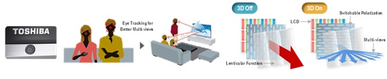 正當快門式與偏光式技術相互廝殺的同時,Toshiba已悄悄地發布裸眼式3D電視,將3D電視的技術競爭提升到另一個新的層次。Toshiba除了以12寸和20寸等級來試探市場外,還在2011 CES上展示56寸和65寸的裸眼式3D電視。雖然除了Toshiba外,SONY和LG也分別展示裸眼技術的3D電視,但是僅有Toshiba宣示將於2011年生產大尺寸的裸眼式3D電視,特別是2011年底發布的55X3。