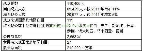 第十七屆「廣州國際照明展覽會」展覽麵積達21萬平方米,規模較2011年增長5%,參展企業2653家,比上屆減少9%,參展企業來自全球27個國家和地區。本屆展會觀眾數目同創新高,吸引了110,406名觀眾,較2011年增長10%,分別來自111個國家及地區,其中國內專業觀眾89,429人,較2011年增加11%,海外專業觀眾20,977人,較2011年增加5%,海外觀眾前十位來源地分別是港澳台地區、印度、韓國、美國、新加坡、日本、泰國、澳大利亞、馬來西亞和德國。大會同期舉辦的各類技術研討會、產業高峰論壇、產品推介會、交易節等高水平會議、論壇交流活動多達110多場次,較去年增加10場,亦創新高。
