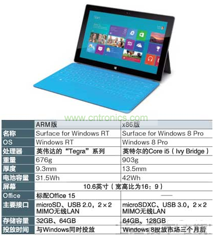 微軟的平板終端名為“Surface”,微軟讓Windows 8平板終端繼承了支持觸摸操作的桌麵型計算機的名稱。新款終端備有配備ARM架構SoC的“Surface for Windows RT”,以及配備x86處理器的“Surface for Windows 8 Pro”兩款機型,前者將與Windows 8同時上市(圖1)。