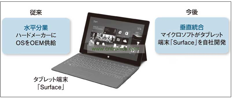 首先微軟發布了其自主開發的平板終端“Surface”,分為配備“Winodws 8”的機型和配備ARM處理器用“Windows RT”的機型,將與預定2012年內發布的Windows 8同時發售。微軟長期采用向電腦廠商提供OS的水平分工模式,而此次卻在平板終端業務中采用了自行開發硬件的垂直整合模式(圖)。