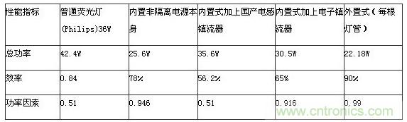 我們知道,最普通的熒光燈的起輝是采用一個串聯的鐵芯電感和一個並聯的起輝器(圖3a)。對於這種電路在用LED日光燈直接替換時,隻要拔掉起輝器就可以了。但是由於鐵芯電感仍然串聯在電路中,所以它仍然帶來將近6.4W(Philip)到10W(國產)的損耗,結果由於這部分的額外損耗就大大降低了LED的節電功效。例如,本來一個20W的LED日光燈可以取代一個36W的熒光燈,以內置非隔離式的20W LED日光燈為例,實測結果如下。